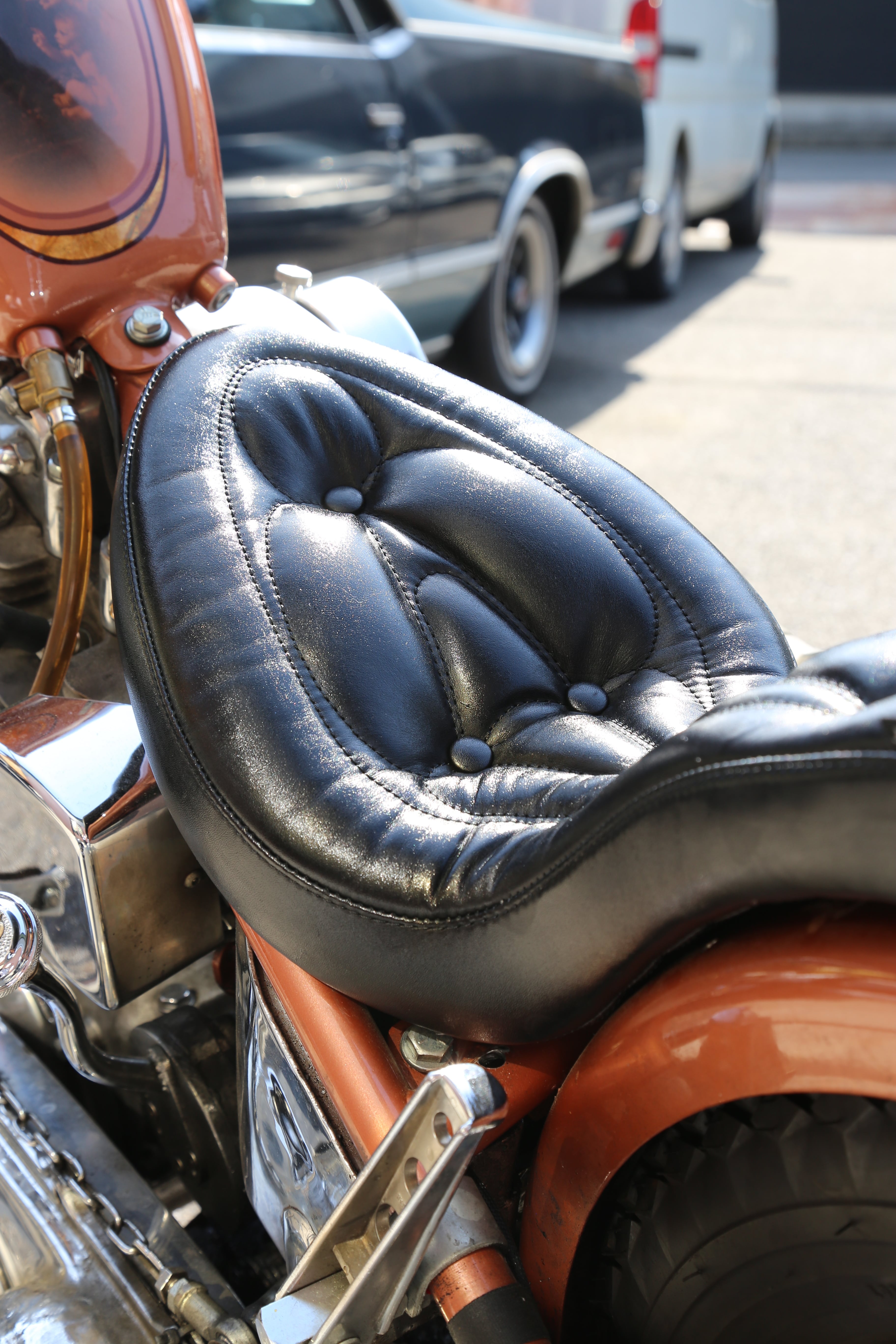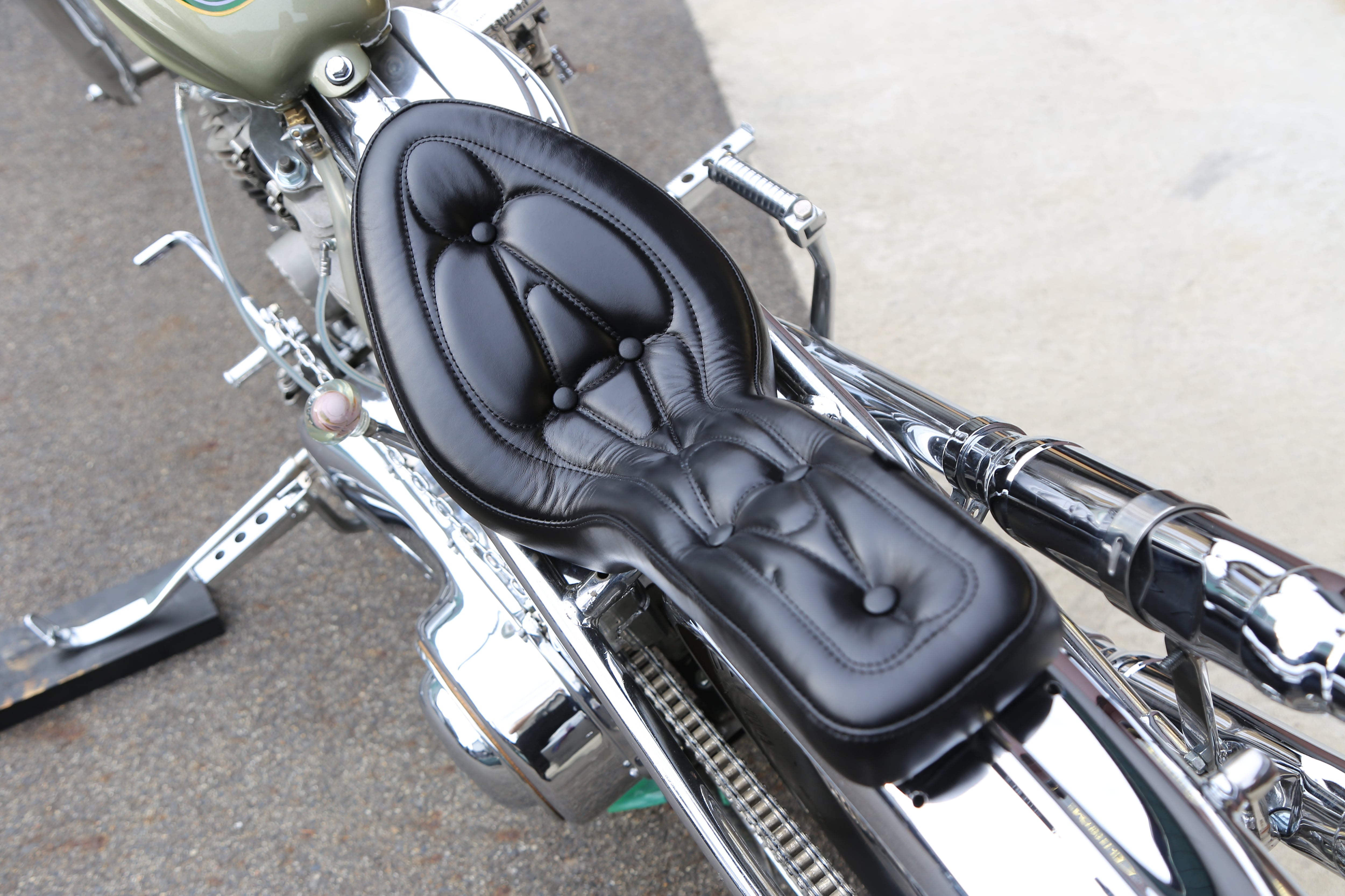 チョッパーシートにおいて、最初期のボタンタフト・パターンのデザインであり、業界において重要な意味を持つデザインの一つと考えています。