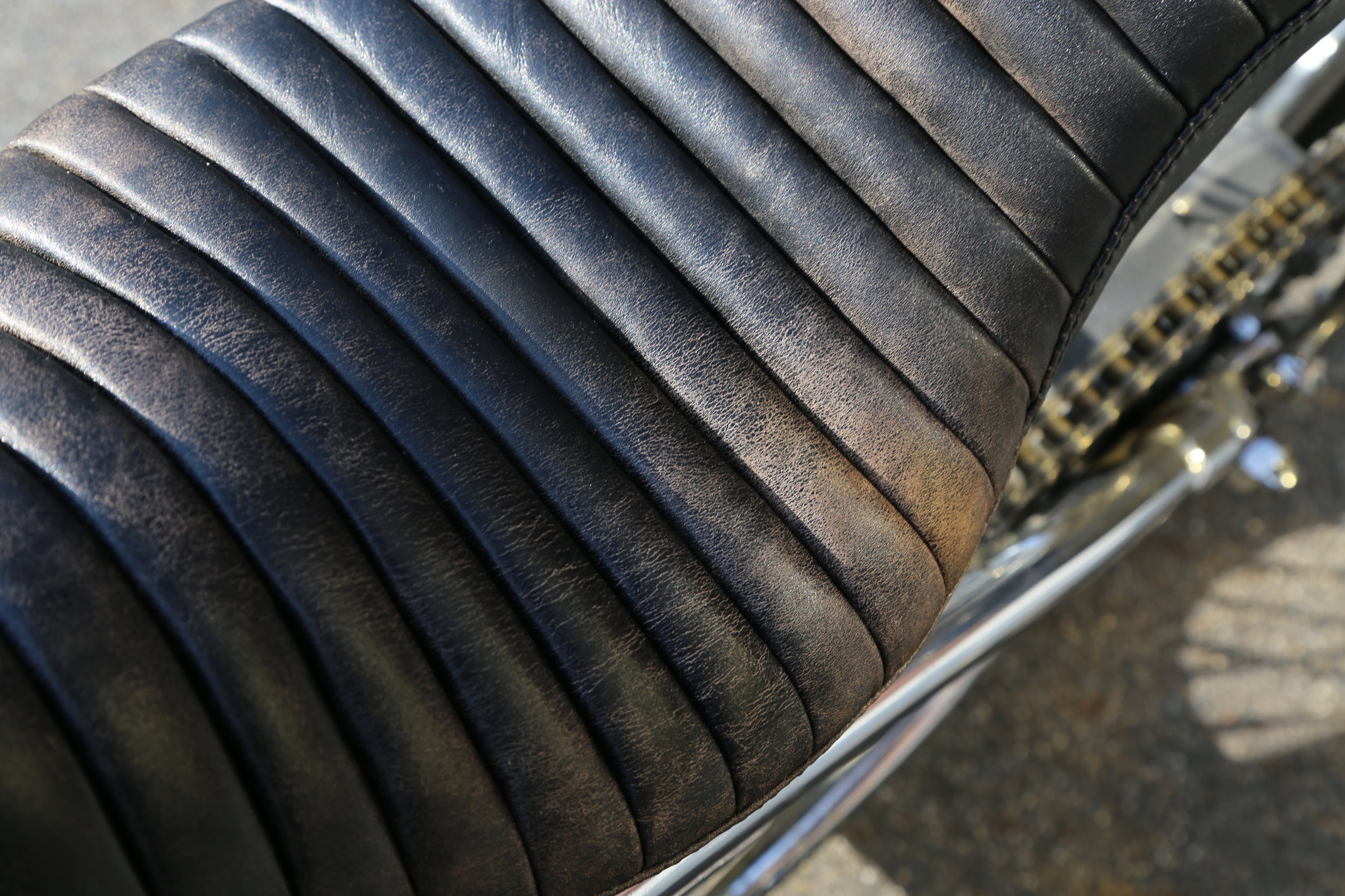 熟練の職人がクラック加工を施しており、実際に5〜60年の年月を重ねることで起こる経年変化をそのまま再現したエイジングレザーを使用することで、ここまでリアルな仕様の自然なビンテージの雰囲気を醸し出すシートが完成しました。