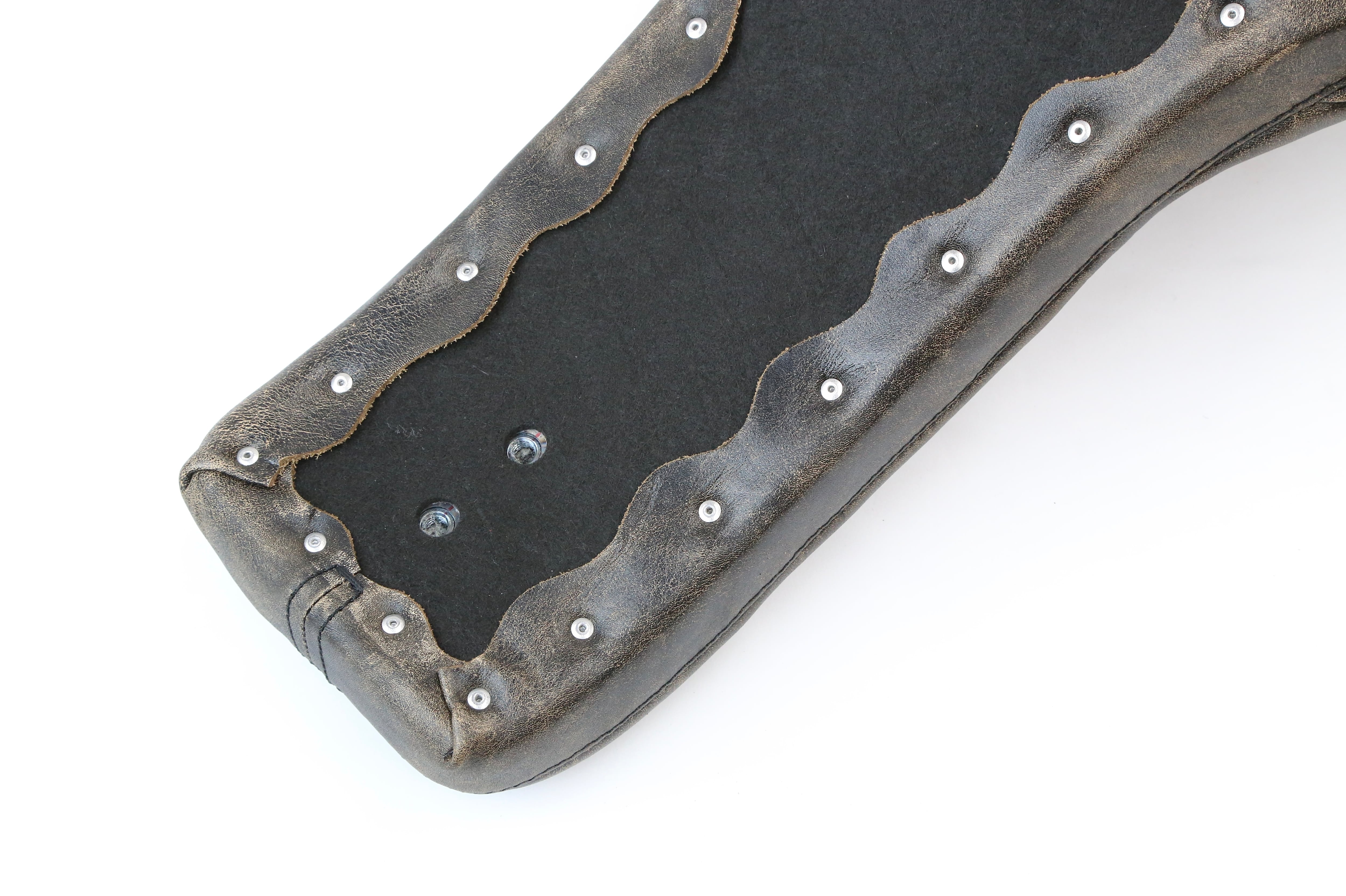 本製品の特徴は、ヤスリや塗装による表面的なエイジングではなく、実際に50〜60年の年月を経て生じる革の経年変化を再現したレザー表現にあります。